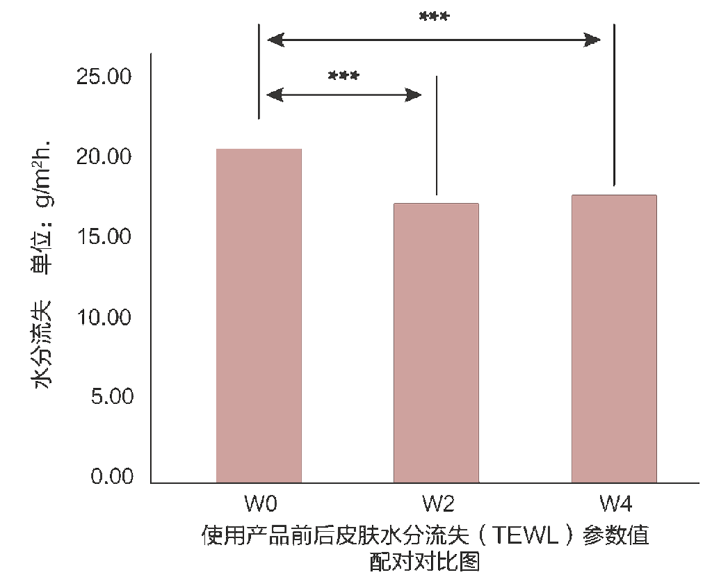 經(jīng)皮水分流失(TEWL)通過(guò)測(cè)定皮膚表面的水蒸氣壓梯度表明水分散失的情況,從而反映皮膚的水通透屏障。當(dāng)屏障功能受損時(shí), TEWL值增高;相反地,TEWL降低,提示屏障的修復(fù)。利用皮膚水分流失測(cè)試儀Tewameter對(duì)31名健康女性志愿者進(jìn)行研究, 志愿者平均年齡為48歲,每天使用2次濃度1mg/ml的去端肽膠原蛋白精華液產(chǎn)品,連續(xù)使用14天,與使用前相比較,皮膚水分流失減少17.51%(p<0.001);